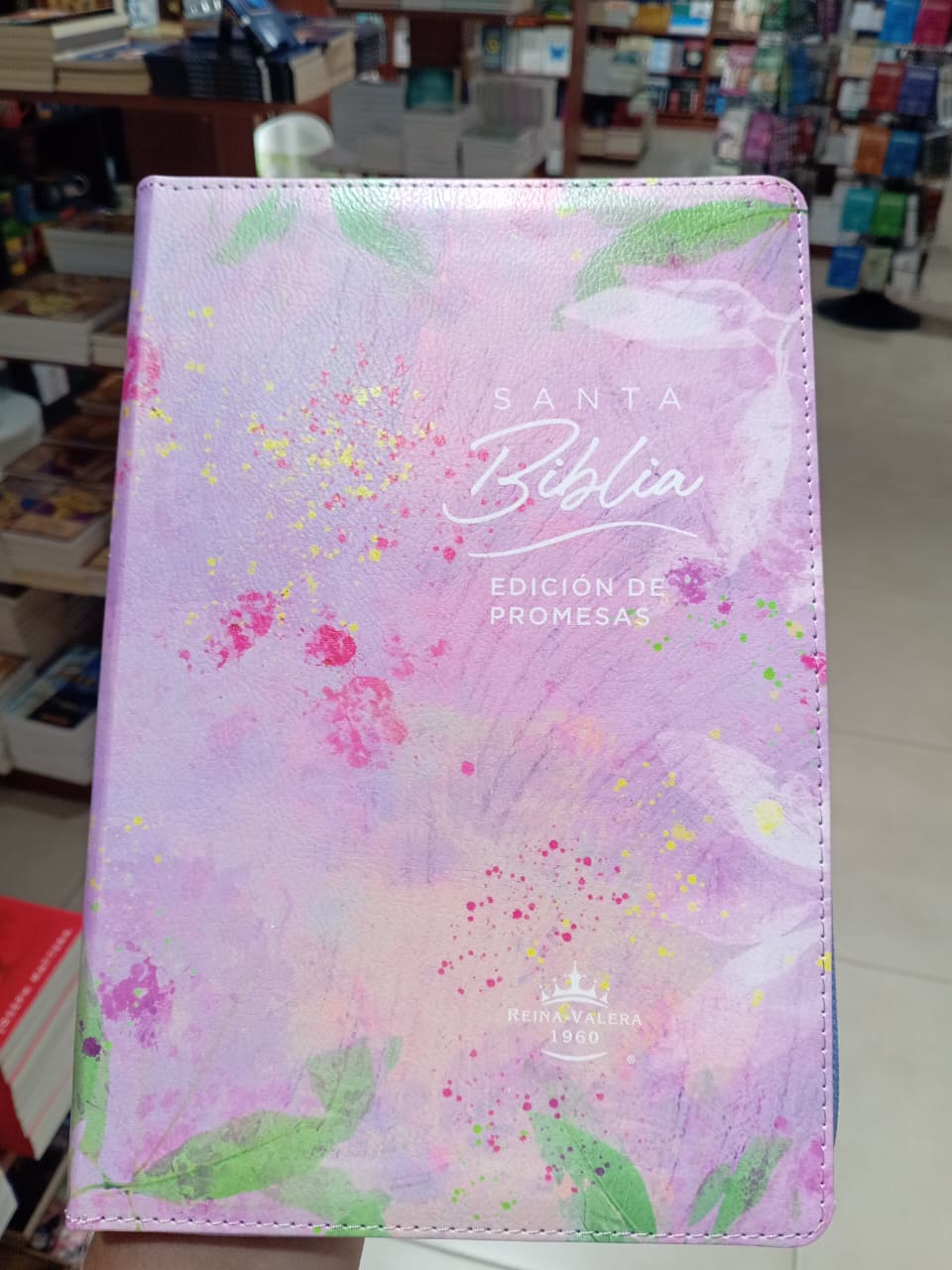 Santa Biblia de Promesas Reina-Valera 1960 Letra Gigante - 13 Ptos. Piel Especial c/Índice y Cierre / Floral / Rosa / cantidad